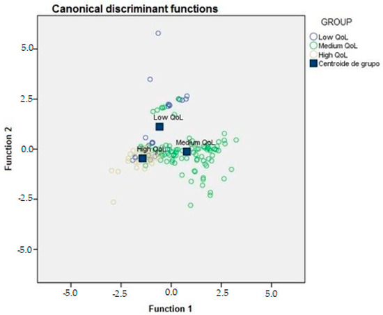 The non-standardized coefficients of each independent variable enabled the formulation of discriminant functions for each of the three groups and for a description of the coordinates of the groups’ centroids. Centroids are measurements applied to assess the typical points of individuals in a group and to graphically illustrate the distancing level between groups. The centroid coordinates for each group were obtained through the discriminant analysis, which highlighted the distancing level and individuals’ typical points. Canonic discriminant graphics were plotted to help visualize the groups, showing individuals’ distribution based on common features.