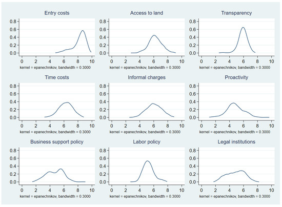 Distributions of PCI sub-indices. Notes—This figure plots the Kernel density estimations of nine PCI sub-indices. The data cover 63 provinces between 2010 and 2015. Data obtained from VCCI.
