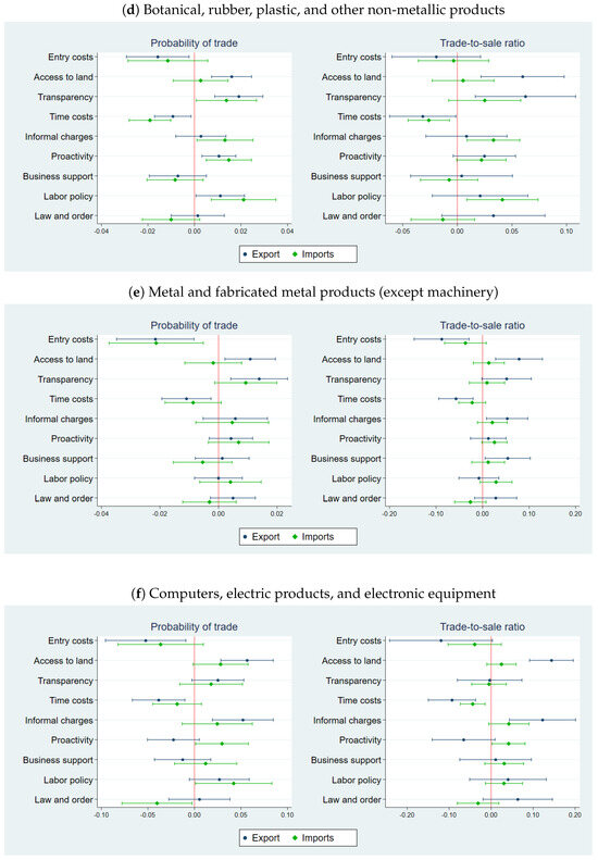 Botanical, rubber, plastic, and other non-metallic products. Exports and imports of firms in this sub-sector were affected by different institutional factors. While better labor institutions and informal charges improved exports, easier access to land and better transparency raised the probability and magnitude of imports (Figure 3d).