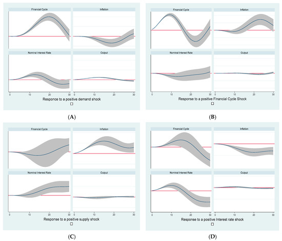 SVAR impulse response functions. Source: Author’s own estimates. (A): Response to a positive demand shock, (B): Response to a positive financial cycle shock, (C): Response to a positive supply shock, (D): Response to a positive interest rate shock.