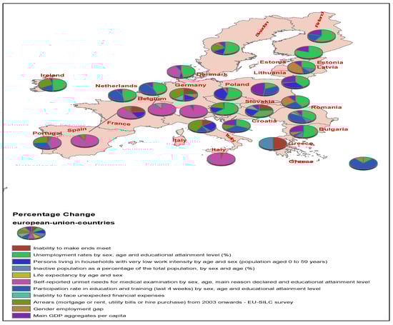 At this stage, it is appropriate to present initial GIS data on the percentage change in the individual factors that make up the composite quality-of-life index in the EU countries. Figure 1 below shows the data representing the percentage change in the values of the quality-of-life factors selected for inclusion in the survey. The percentage change in the values of quality-of-life factors is represented by the magnitude of change in each factor in the pie chart presented for each country. The graphs are dominated by the elements of the factors that show the greatest change in the period of 2019–2021, whereas the rest of the factors either did not change, or their change was very small. For example, in Italy and Spain, there is a significant increase in the need for medical examination, and in Greece, there is a significant change in the ability of citizens to cope with their obligations [to make ends meet] as well as an increase in the number of inactive citizens. In addition, a significant number of countries are experiencing a change in the unemployment rate.