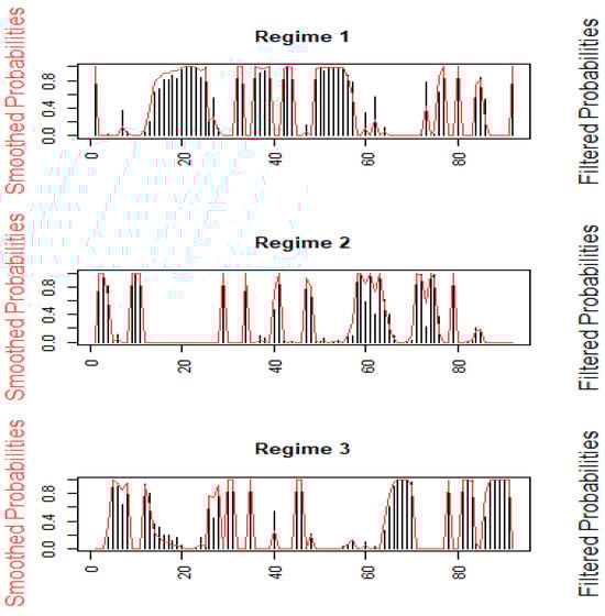 In the case of the estimating equation, the dependent variable comprises a set of financial variables of interest, namely, financial indices. On the other side of the equation, corresponds to the intercept of each state. Additionally, represents the matrix of invariant independent variables of their state, which corresponds to our set of dichotomous variables reflecting the quarters where events occurred. Finally, the formation of the matrix of independent variables that vary depending on the state represents our vector of independent variables showing macroeconomic dynamics. Lastly, the error variable is included.