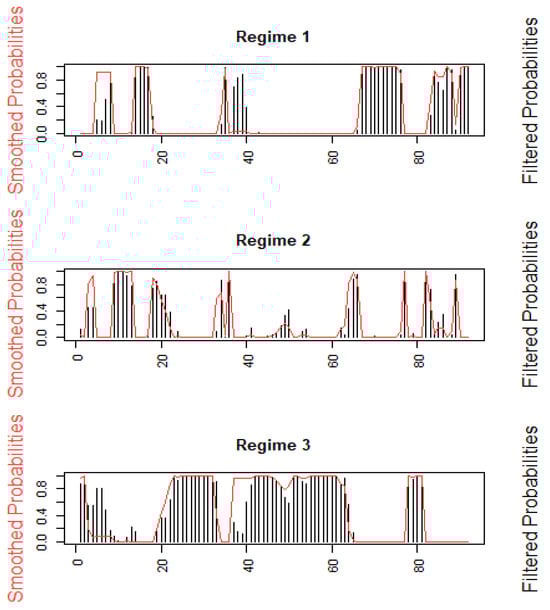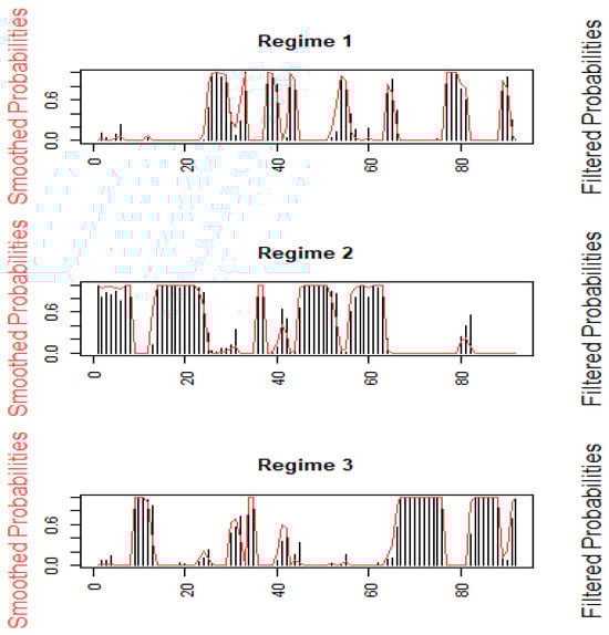 Regime 1 shows frequent shifts away from low volatility, indicating dynamic market changes. Regime 2 highlights frequent transitions to and from medium volatility, reflecting moderate market uncertainty. Regime 3 demonstrates prolonged periods of high volatility, indicating sustained market stress, which is more pronounced during the peak periods of the COVID-19 pandemic and the GFC (Figure 2) (Bhar and Malliaris 2021).