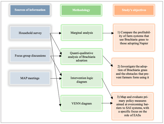 The methodology applied in the present study consists of the following analytical steps: (i) a marginal analysis comparing the profitability of Brachiaria grass to the conventional fodder used at the farm level (Napier); (ii) a descriptive analysis examining Brachiaria’s adoption rate and determining the associated barriers; (iii) an intervention logic diagram identifying and evaluating policy objectives and strategies to overcome obstacles and limitations faced by farmers in adopting SAI systems; and (iv) a VENN diagram investigating the role and impact of EASs services. Figure 2 shows the linkage between paper objectives, methods employed, and sources of information.