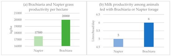 According to the theory of expected utility, a farmer’s decision to adopt or not adopt a technology such as Brachiaria grass, given the risk and unknown prospects, is based on the maximisation of profits (Maina et al. 2019). In this regard, it is critical to understand the levels of performance attained by farmers in forage-livestock production systems, as well as the financial viability of Brachiaria-based systems with respect to those based on conventional forages. Figure 3 illustrates the difference in terms of grass biomass (kg/ha) and livestock productivity (litres of milk/head/day) between Brachiaria and Napier. In terms of biomass produced, results show that the productivity of Brachiaria per hectare of cultivated land is higher with respect to Napier grass. Additionally, the data indicate that using Brachiaria as animal feed increases milk production.
