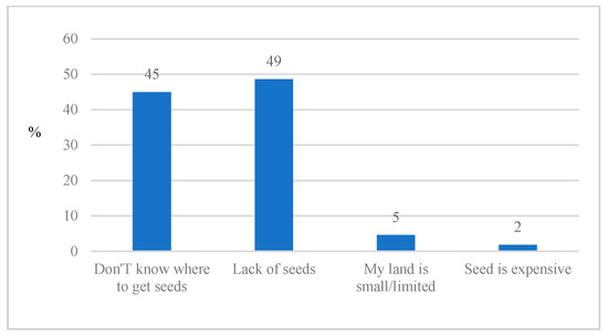 Although the adoption of Brachiaria allows farmers to benefit from undoubted improvements in terms of productivity and profitability, this climate-smart forage remains scarcely used. As illustrated in Figure 4, the majority of farms surveyed are unfamiliar with Brachiaria. Out of the 20% of farmers who know about this improved forage, only 10% actually use it on their farms. As illustrated in Figure 5, household survey data indicates that the main reason why farmers do not use Brachiaria is connected with the lack of access to seeds. This result was also confirmed by information gathered during the FDGs held in the two districts under investigation. In relation to the general constraints characterizing the livestock-dairy value chain, participants were asked to focus on the barriers to the adoption Brachiaria grass in the study area. Specifically, the following issue arose during the meeting: “What could be the main constraints to the adoption of Brachiaria grass faced by local farmers and other value-chain actors?”. In both districts, what emerged from the discussion was that lack of information and technical knowledge, as well as lack of seeds and high input costs, are the main barriers to the adoption of Brachiaria. Furthermore, during the meeting’s discussion, the lack of recognition of Brachiaria among the surveyed farmers was attributed to the fact that this improved forage is relatively new in Africa (despite the aforementioned African origins). The barriers directly related to the use of Brachiaria were also associated with threats related to the variability of climate conditions, the increasing incidence of pests and diseases, and the diminishing fertility of the soil. On the other hand, as highlighted by the focus groups’ participants, widespread adoption of Brachiaria might be viewed as both a development opportunity and a strategy to be combined with increased utilisation of improved highly productive dairy cows (an initiative supported by the one cow per family national policy).