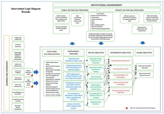 Based on the benefits associated with Brachiaria and its low adoption rate in Rwanda, this study examines policy and strategies put in place to promote the adoption of such climate-smart technology and to improve the livestock-dairy value chain as a whole. Figure 6 shows the Intervention Logic diagram, which maps the relationship between policies (their instruments and measures and their specific, intermediate, and global objectives), the institutional environment, and the barriers hindering the transition to the adoption of climate-smart innovations and market-oriented agricultural systems.