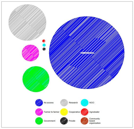 As illustrated in Figure 7, most farmers have no access to any form of extension. Extension service system reaches only 12% of the sample. Additionally, the government, research institutions, and farmer-to-farmer programmes are the major sources of EASs services for smallholders, with a small percentage of farms receiving them from NGOs, private providers, and agrodealers. Furthermore, in the case study area, no farm has received extension services from cooperatives or community-based organizations. As highlighted during the MAP meetings, farmers mainly have access to services such as fodder management and selection and land preparation while the extension services related to the other farming activities are not available.