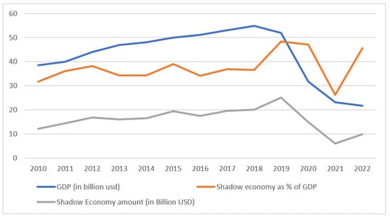GDP and shadow economy trends over time (2010–2022), adapted by the authors. Source: Kareh (2020); World Bank (2023).