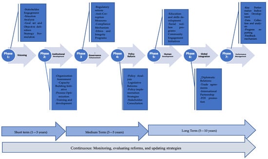 Figure 7 illustrates a comprehensive framework for combating political patronage, corruption, and crony capitalism by integrating New Institutional Economics (NIE) principles with Project Management methodologies. At the core of the framework are seven interconnected phases: Strategic Vision and Planning, Institutional Strengthening and Capacity Building, Transparency and Accountability, Policy Innovation and Adaptability, Investment in Human Capital and Social Development, Regional and International Engagement, and Monitoring and Evaluation. Each phase addresses specific aspects of governance reform and economic development, leveraging NIE insights to analyze institutional contexts and employing Project Management practices to design and implement effective interventions. By integrating efforts across these phases, countries can develop holistic strategies to combat corruption, enhance transparency, and promote inclusive growth, fostering sustainable development and governance outcomes.
