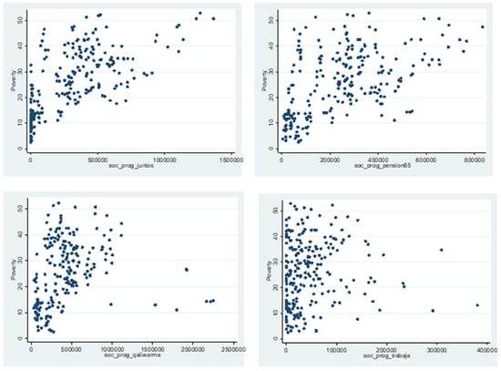 We studied the four most representative social programs: The National Program of Direct Support to the Poorest Juntos, National Solidarity Assistance Program Pension 65, National School Nutrition Program Qali Warma, and Program for the Generation of Social Inclusive Employment “Trabaja Perú”. Additionally, socioeconomic variables, such as unemployment, gross Domestic Product per capita (income), human capital, physical infrastructure, and rotated expenditure were analyzed. Also, dummy variables on the occurrence of COVID-19 and the “El Niño” phenomenon (FEN2017) were included.