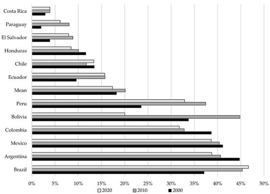 In the end, the countries with the highest ratios (as an average for the period) are Argentina (42%), Mexico (41%), and Brazil (39%), followed by Colombia, Bolivia, and Peru, with percentages of 30 to 34%. Lower ratios were observed for Ecuador, Guatemala, Chile, and Honduras, with percentages of 15 to 10 percent. Finally, El Salvador, Paraguay, Costa Rica, and Panama had ratios of less than 10%.