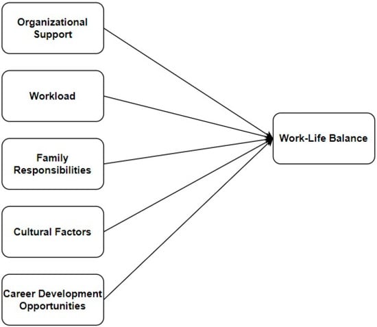 As illustrated in Figure 1, the research model and conceptual framework provide a structured approach to understanding work–life balance among female staff members in higher educational institutions in Oman. By incorporating components such as organizational support, workload, family responsibilities, cultural factors, and career development opportunities, this framework guides the analysis of factors influencing work–life dynamics. By elucidating the interplay between individual, organizational, and cultural elements, the research model serves as a foundation for investigating work–life balance perceptions and experiences, informing the development of targeted interventions and policies to enhance employee well-being and organizational effectiveness.
