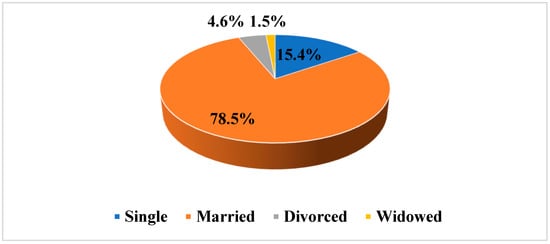 Figure 2 describes the subjects’ marital status, and there was a total of 260 valid responses. Most respondents, 78.5%, are married, making the proportion significant. Single people form 15.4%, while others who are divorced compose 4.6% of the respondents. A smaller group, 1.5% of the sample, are widowed. These figures are cumulative, with participants who are married making up 93.8% of the cumulative percentage. This shows the running total percentage when added to the previous topics. Widowed respondents increase the cumulative percentage to 100%. This distribution shows that most respondents are currently married, and this could affect the survey. It is particularly useful to examine the relationship between marital status and work questions as a way of looking for an influence on work–life balance.