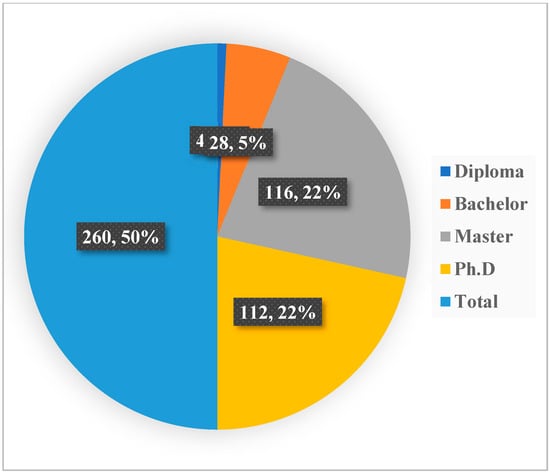 This study categorized the position levels of the respondents into entry-level and senior-level positions, and is presented in Figure 5. Regarding entry-level positions, a substantial number (92 respondents, 35.4% of the 260 total) belong to this category. Entry-level positions include technician or assistant lecturer positions. They normally represent the beginnings of academic and technical careers within educational institutions. On the other hand, most (168 respondents, 64.6%) participate in senior-level positions, specifically as lecturers. Therefore, a larger segment of the survey population has evolved beyond entry-level status. This suggests a degree of experience and career advancement among the staff. It should be noted that the survey only involved these two levels. The distribution of the responses across these two categories shows the professional composition of the staff within the educational institutions: all the respondents—as the 100% total cumulative percentage attests.