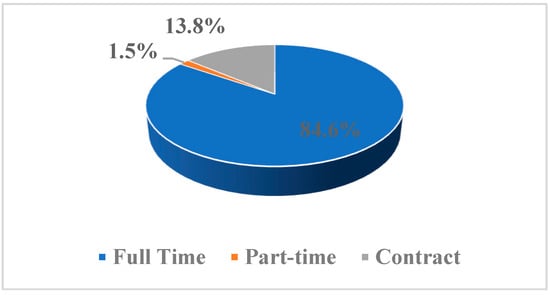 Figure 4 illustrates that most employed individuals, totaling 220 (84.6%), work full-time. This indicates that full-time employment is predominant within the surveyed institutions. Part-time employment is less common, with only four individuals (slightly over 1%) working under such conditions, suggesting either a limited availability of part-time roles or less preference for them among employees. Contract employment, at 36 respondents (13.8%), appears more frequent than part-time roles, reflecting a considerable number of temporary positions where employees may not work the full 40 h week. While specific job breakdowns are not detailed, it is evident that full-time positions overwhelmingly dominate within these institutions, encompassing every surveyed role. The total percentage summing to 100% underscores the comprehensive nature of the survey’s findings on this matter.