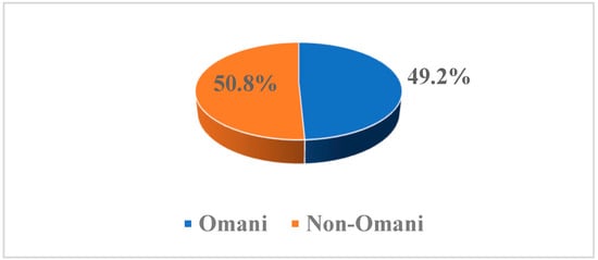 Figure 6 shows that the sample is quite evenly divided in terms of nationality, with non-Omani nationals representing a slightly larger portion of the survey respondents (50.8%) than Omani nationals, who account for 49.2%. This balanced representation will hopefully yield a broad perspective on work–life balance issues, with the potential to reflect various cultural viewpoints in the context of the survey equation.