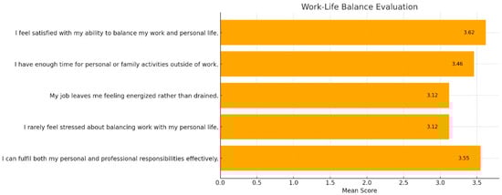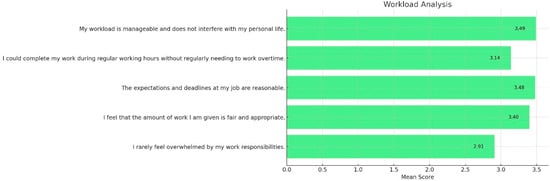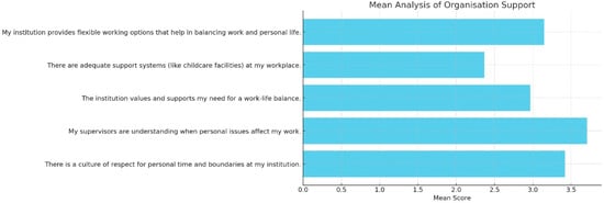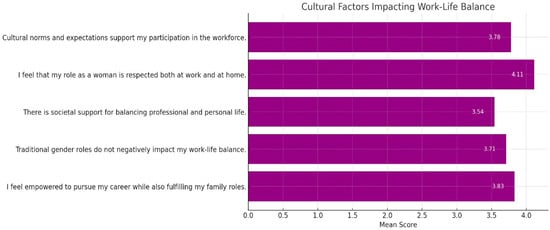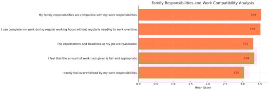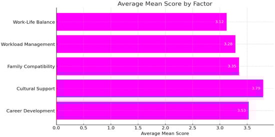 The Likert scale employed in the analysis consists of five points with the following corresponding descriptors: “Strongly Disagree”, “Disagree”, “Neutral”, “Agree”, and “Strongly Agree”, representing the numerical values from 1 to 5, respectively. This scale is instrumental in gauging the extent of agreement or disagreement among respondents across different dimensions such as organizational support, workload, family responsibilities, cultural factors, career development opportunities, and work–life balance. Higher mean scores indicate a stronger consensus or positive perception regarding the statements assessed, while lower scores suggest greater disagreement or a more negative outlook. These descriptors are essential for accurately interpreting the degree of alignment or divergence in employees’ perspectives on various aspects of their professional roles and personal lives within the organization.