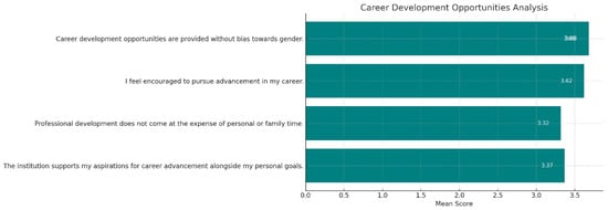 The institution values and supports my need for a work–life balance. (Mean: 2.97): The moderate score of 2.97 suggests that while employees may feel some support in their work–life balance endeavors, a significant increase in this area may be within reach. Implementing and refining policies and programs that are specifically designed to support work–life balance—such as initiatives to support overall wellness, access to resources that support mental health, and family-friendly benefits—can signal a more robust commitment to employees’ well-being. Frequent feedback mechanisms can also help to assess their effectiveness and identify areas for improvement.