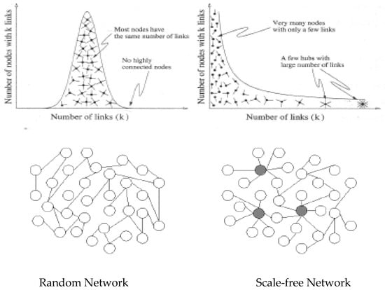 Schematic comparison of the distribution of links (k) in random networks where most nodes have the same number of links and scale-free networks where a few nodes can have a large number of links, resulting in the formation of hubs ().