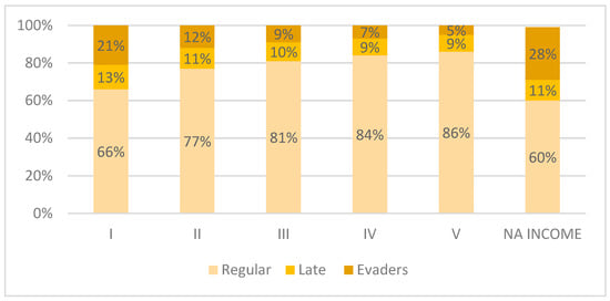 Observing the car owners’ distribution of regular and late payers in relation to income quintiles (see Figure 2), the data show that the share of car owners paying in due time increases with income, while the percentage of evaders and late payers decreases with income. However, it is worth noting that for most tax evaders, income data are not available8. We hypothesize that this lack of information could stem from either a correlation between undeclared income and evasion of car taxes or the possibility that many of these taxpayers had no taxable income, being among the poorest segment of the population. This being said, the share of car tax evaders in the group of ‘not-available’ income is much higher than in the overall sample (28% vs. 13%; see Table 2).
