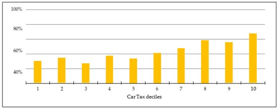 Among the socio-economic and demographics variables, households’ income and occupational status play a significant role on the willingness to evade taxes (at the individual level). According to the literature, as per other types of income taxation (see, e.g., Torgler and Valev 2010), higher levels of car tax evasion are present among the self-employed, while, as expected, retired people and employees have higher levels of tax compliance. Moreover, in line with what was discussed in Section 2, higher income levels correspond to lower evasion (see Figure 2), while ceteris paribus, no-available-income taxpayers are significantly more likely to engage in tax evasion (by approximately 20%).