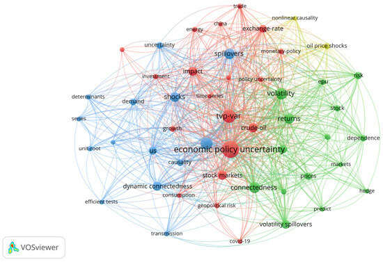 Co-occurrence network of keywords from the search terms EPU OR “Economic Policy Uncertainty” AND TVP-VAR. Source: authors’ analysis using VOSviewer with data from Scopus and Web of Science.