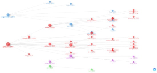Figure 2 illustrates a single cohesive cluster, indicating a concentrated lineage of influence within the field. Thus, this presents a historiograph of the academic development of EPU and Time-Varying Parameter Vector Autoregressive (TVP-VAR) research, with four clusters differentiated by color (red, blue, purple, and green) to indicate thematic or methodological groupings. Then, each color represents a distinct subfield, such as foundational works (red), regional applications (blue), sector-specific studies (purple), and emerging themes (green). This visualization captures the evolution and diversification of research, highlighting foundational studies and their subsequent influence on specific subfields. The leading studies are centered around key influential studies, notably Gabauer and Gupta (2018) in red, which acts as a critical node for the entire network. This study explores internal and external EPU spillovers between the U.S. and Japan, pioneering the disaggregation of monetary, fiscal, currency, and trade policy uncertainties. Also, this highlighted the Fukushima Daiichi accident as a substantial negative trade shock, demonstrating how discrete events can propagate international spillovers, particularly in monetary policy.