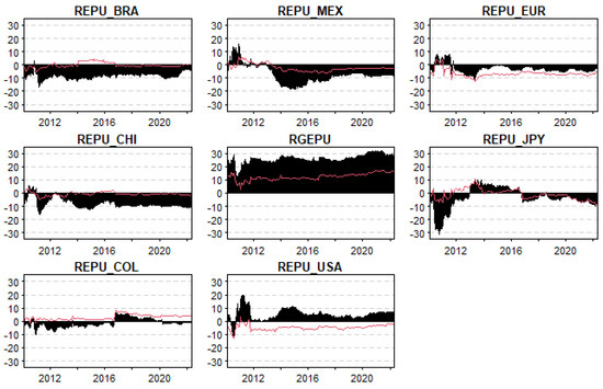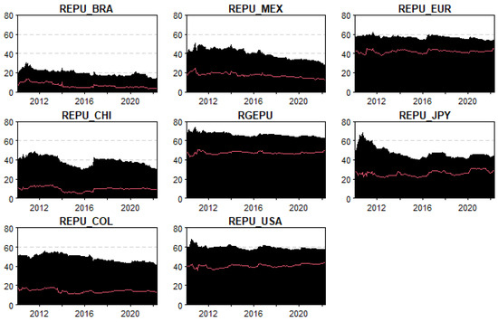 The data selection for the chosen Latin American countries—Brazil, Chile, Colombia, and Mexico—was based on their shared macroeconomic frameworks, specifically their similar exchange rate regimes (floating and free-floating) and their adoption of inflation-targeting monetary policies. Additionally, the availability of consistent and reliable data for these countries was a fundamental factor in their inclusion, as they represent the major economies in Latin America. Other Latin American countries were excluded due to the lack of such data, which would have compromised the robustness and comparability of the analysis. Furthermore, the selected countries are the largest and most influential economies in the region, accounting for a significant proportion of Latin America’s GDP. This selection ensured that the analysis would be robust and comparable across all regions examined, providing meaningful insights into the dynamics of economic policy uncertainty in the region.