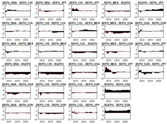 Figure 10 offers a focused analysis of internal net pairwise total directional connectedness, showing how EPU index returns flow between individual economies over time. Each subplot illustrates a unique pairwise relationship, highlighting directional influence through periods of net positive connectedness (black shaded areas for outward influence) and net negative connectedness (red lines for inward influence). This detailed view complements the broader trends in previous figures by capturing the dynamic, bilateral interactions between specific economies.