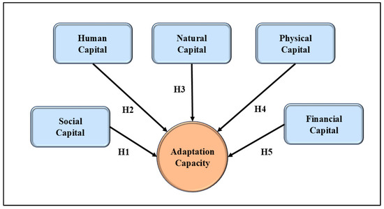 Central to understanding adaptive capacity is the recognition that it emerges through multiple forms of capital, each offering distinct yet interconnected contributions to resilience. By examining how human, social, natural, physical, and financial capital interact and reinforce one another, we gain a more holistic perspective on how communities respond to shocks (Scoones, 1998; Bebbington, 1999; Ellis, 2000). The conceptual model (Figure 1) illustrates five key capitals hypothesized to influence adaptive capacity, informed by the SLA and a wealth of theoretical and empirical studies across disciplines.