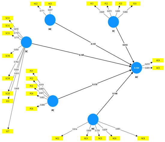 Based on the results (Table 5 and Figure 4), the R-square value is 0.184. Therefore, adaptive capacity is said to be a weak model which indicates the model has quite low predictive power. Next, the significance value calculation is carried out to determine the significance value of each path coefficient in the SEM-PLS model. Variables have a significant relationship only if they have a t-statistic > t table. So, the p value is >0.05. Based on the significance value, it is known that each path coefficient has a significant and positive value. The significance value of the SEM-PLS model is shown in the table above showing each significance value of the research variables.