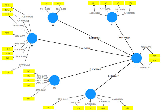 - Financial capital does not have a significant influence on adaptive capacity. The relationship created by financial capital has a t-statistic value of 0.232, so it is <1.96 (t-table). Then, the total p value is >0.05, with a value of 0.817. Therefore, the result indicates that the value exceeds the threshold and does not meet the criteria for significance. So, financial capital does not have a significant influence on adaptive capacity, with an original sample value of 0.014.