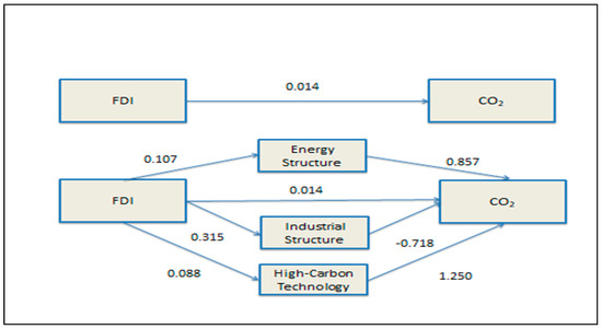 where , , are the intercepts; , and are residual errors, and time is denoted as t; is the independent factorand implies FDI inflows; the dependent variable is presented in and shows the CO2 emissions; comprises the mediator variables where M1 is the energy structure; M2 is the industrial structure; and M3 is the economy’s high-carbon technology. In Equation (5), we include economic growth and urbanization as two control variables. is the total effect of FDI inflows; is the effect of FDI inflows on Mi; bi is the effect of Mi of CO2 emissions, after controlling the influence of X; aibi is the specific indirect effect of FDI inflows on CO2 emissions via Mi. The direct effect of FDI inflows on emissions after controlling the mediators is presented with c′ and is the total mediation effect.