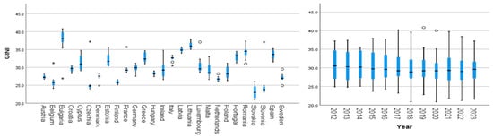 - GINI: GINI coefficient of equivalized disposable income − (scale from 0 to 100) (Eurostat, 2024c);