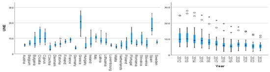 - UNE: unemployment rate (%) (Eurostat, 2024h);