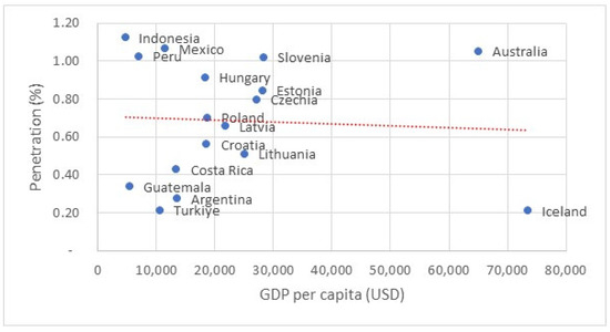 Enz (2000) argues that the income elasticity of demand for insurance declines as GDP grows, and their relationship follows an “S” pattern, with income elasticity still exceeding one. However, Figure 1 in this study demonstrates a negative trend between income and life insurance penetration after the GDP per capita reached USD 6129.
