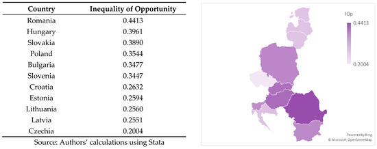 The estimation of inequality of opportunity in income indicates that circumstances beyond the individual’s control drive 11.96% of income inequality. The dominant factor is gender, responsible for 48.4% of the inequality of opportunities, which confirms the persistence of significant wage differences between women and men. Parents’ education is another major determinant, with a greater influence of maternal education (15.44%) than paternal education (14.13%), and the mother’s sector of activity has a net higher impact than that of the father. The socio-economic status of the family of origin, approximated by the number of books in childhood, contributes 7.42%, while place of birth and country have low shares. The analysis by country shows high levels of inequality of opportunity in Latvia, Hungary, and Estonia; moderate levels in Bulgaria, Croatia, Czechia, Slovakia, and Slovenia; and low levels in Lithuania, Poland, and Romania.