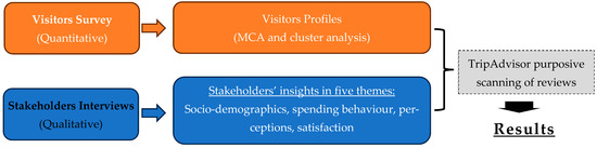 This study employed a mixed-methods design to examine the contribution of wine tourism to local development in Nemea (see Figure 1). The approach integrated qualitative and quantitative components to enhance robustness and capture different dimensions of the research scope. Specifically, three sources of evidence were combined: (i) open-ended interviews with key local stakeholders to explore perceptions of wine tourism and development challenges; (ii) a structured visitor survey analysed with multivariate statistical techniques (MCA and cluster analysis) to identify behavioural patterns and visitor profiles; and (iii) a purposive scan of TripAdvisor reviews, used solely as supplementary evidence for triangulation, to check whether visitor perceptions echoed the themes emerging from interviews and surveys.