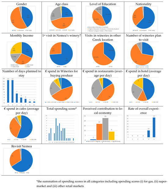 Given the above fact, the survey was conducted in wineries that are accessible to the public without prior arrangement. Although exact visitation shares across all wineries in Nemea are not systematically reported, local stakeholders consistently highlighted that five wineries are those that attract the vast majority of wine tourists. For this reason, they effectively represent the main gateway to wine tourism experiences in the region.