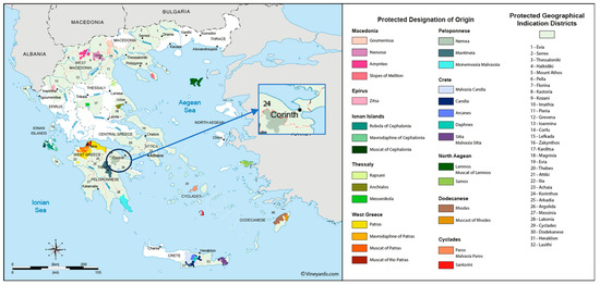 Map of PDO wines in Greece and location of Nemea. Source: https://vineyards.com/photos/maps/Greece%20Wine%20Map.png, accessed on 16 July 2025.