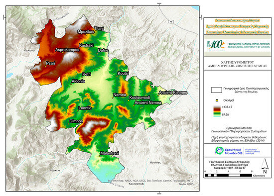 One of the most prominent wine-producing areas in Greece is Nemea. It stretches across approximately 2100 hectares within 17 villages in the northeast Peloponnese, spanning the southern part of Corinthia and a small segment of Argolida at elevations between 200 and 850 m (see Figure 3 and Figure 4). The region is closely associated with the Agiorgitiko grape variety, primarily cultivated within the Nemea Protected Designation of Origin (PDO), which holds both economic and oenological significance for the Greek red wine sector (Miliordos et al., 2024; Kazou et al., 2023).