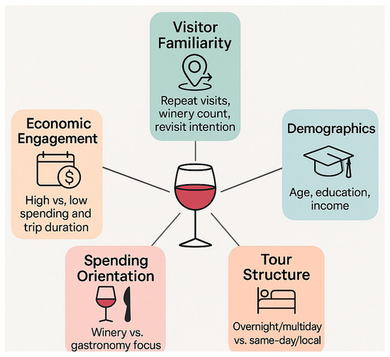 - Dimension 5: Tour Structure—Overnight vs. Local (4.40% of inertia explained). This dimension contrasts the structure of a visitor’s trip, particularly whether they are overnight guests or local/same-day visitors. High scorers report hotel spending and longer stay, reflecting a more immersive travel model, often with time allocated to additional cultural or leisure activities. Low scorers, on the other hand, are typically day-trippers or residents of nearby areas, who may participate in winery tours without engaging with the broader tourism infrastructure. Their presence is valuable for volume, local brand awareness, and word-of-mouth, even if their per-visit impact is limited. This dimension is essential for tourism planning, as it relates directly to infrastructure usage, accommodation demand, and strategic investment needs.