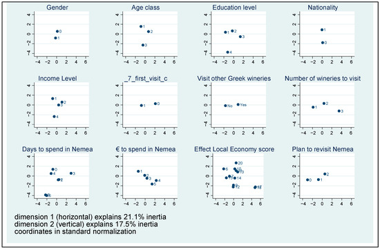 - Dimension 2: Visitor Type and Familiarity (17.55% of inertia explained). The second dimension, explaining 17.55% of the inertia, reflects visitor experience and relational familiarity with Nemea as a wine tourism destination. Tourists with high scores on this axis tend to be repeat visitors, often visiting multiple wineries and expressing clear intentions to return. Their behaviour indicates both personal investment in the destination and sustained interest in its wine-related offerings. In contrast, low scorers are primarily first-time visitors, many of whom limit their exploration to a single winery and do not plan a return trip in the near future. These visitors may have arrived through broader tourism flows rather than a dedicated interest in wine. This dimension therefore articulates a spectrum from loyal, targeted wine tourists to casual or accidental participants, offering insight into how engagement evolves across different types of visitors.
