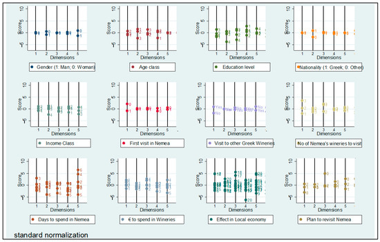 The MCA dimension projection plot (Figure 8) offers a view of how each categorical variable contributes across all five retained dimensions. Dimension 1 is strongly shaped by income level, number of days spent in Nemea, and spending behaviours, reinforcing its interpretation as a measure of economic involvement. Dimension 2 is defined largely by variables such as first-time visitation and familiarity with other wine regions, further validating its link to experiential orientation and touristic intentionality. Additional dimensions, though accounting for smaller portions of inertia, capture more subtle differences. For example, Dimension 3 appears to reflect demographic traits such as nationality and gender, while Dimension 5 includes perceptions of local economic impact, suggesting a latent awareness of tourism’s broader contribution.