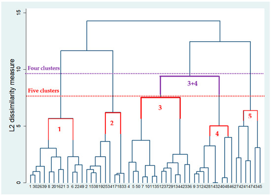 The dendrogram and the stopping rules used for this analysis are presented in Figure 9 and Figure 10. As the cluster analysis results indicate the optimal cluster numbers appeared to be between 4 and 5 clusters, based on the Calinski/Harabasz pseudo-F index and Duda/Hart Je(2)/Je(1) index criteria, respectively. This is also visually presented in the cluster dendrogram (see Figure 10) where the two alternative cluster groups are presented. The difference between the two results is based on the splitting or not of the one bigger cluster in two groups. Indeed, Table 3 presents the population per cluster in the four and five-cluster solutions. The difference appears in the case of clusters 3 and 4 which are grouped together in the 4-cluster solution. The optical appearance of the dendrogram, support the adoption of the 5-clusters solution that keep the dissimilarity index low and allow the formation of relatively more balanced (at least in terms of population) groups.