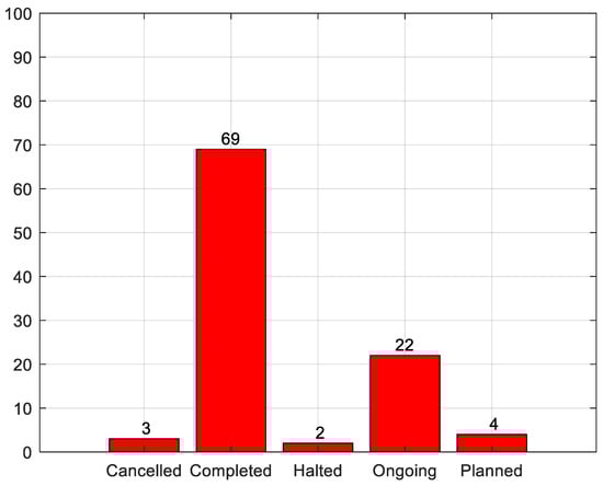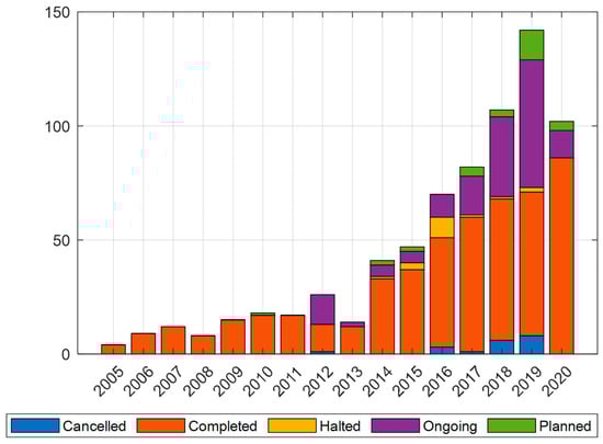 Figure 1 allows us to analyze the status of the 727 projects considered in this article. Currently, 69% of the projects have been completed, 22% have to be completed, 5% have been cancelled or halted, and the remaining 4% are only planned.