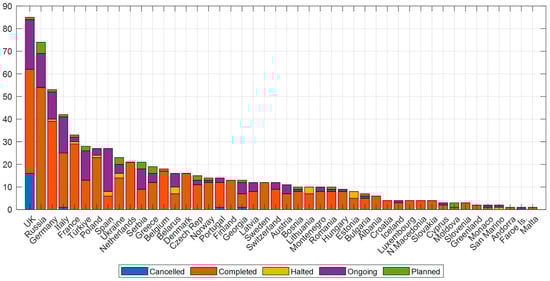 As reported in Table 1, 28 European countries have joined BRI (all EU candidate countries and 17 EU member countries). Only eight European countries have not joined the BRI, and neither are they involved in BRI-like projects: the majority are microstates, except Ireland and Lichtenstein. Figure 3 clarifies the distribution of projects among European countries: 12% of projects are located in the UK, 10% in Russia, 7% in Germany, 6% in Italy, and 5% in France. The remaining 60% of the projects are distributed among the other European countries. It is interesting to note how the vast majority of the projects that have been cancelled are located mainly in the UK, with fewer cases in Italy, Portugal, and Georgia.