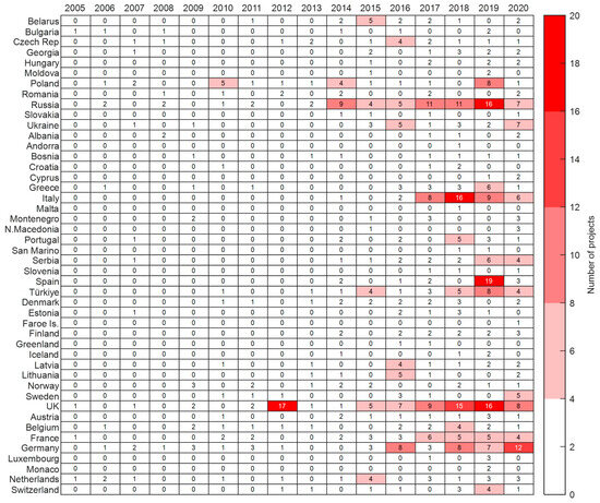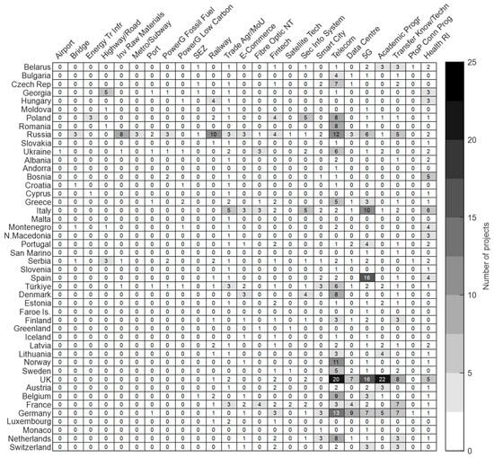 Figure 10 presents the geographical distribution of projects according to their typology. Most telecommunication projects are located in the UK, Germany, Russia, and Norway. Academic programs are concentrated in the UK. 5G projects are concentrated in the UK, Spain, and Italy. Russia is the country with the greatest variety of projects undertaken, followed by Türkiye. Most physical infrastructure (e.g., airports, ports, railways) is concentrated in Georgia, Poland, Hungary, Russia, and Serbia.
