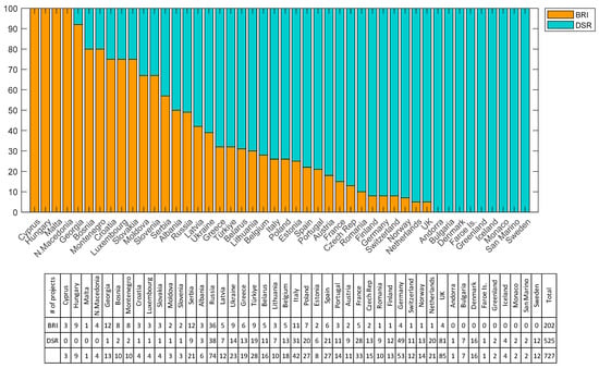 Of the 727 projects analyzed, 72% are classified as part of the DSR, while the remaining 28% are part of the BRI. This suggests that BRI investments in Europe have a high digital content and can be traced back to the DSR. However, these proportions change according to the country, as Figure 5 demonstrates. There is strong heterogeneity among European countries in terms of the dominance of BRI or DSR projects, with some geographical coherence. Indeed, the share of BRI projects is close to or higher than 50% in South-Eastern countries (including Cyprus, Hungary, Malta, North Macedonia, Georgia, Bosnia and Herzegovina, Montenegro, Croatia, Slovakia, Moldova, Slovenia, Serbia, Albania, and Luxembourg as an exception).